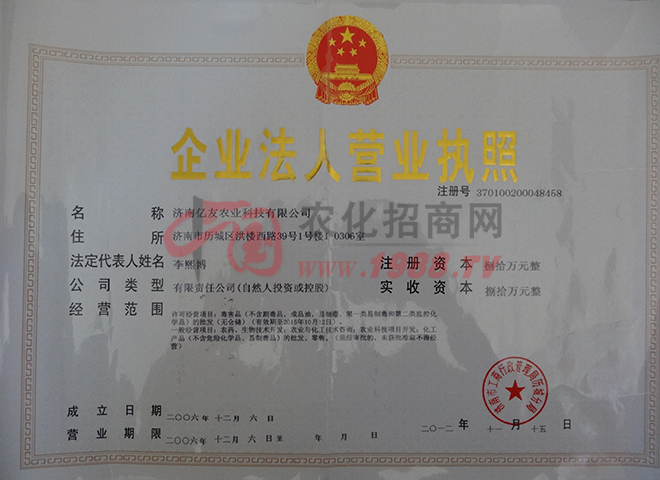 濟(jì)南億友農(nóng)業(yè)科技有限公司成立于2006年12月6日,公司前身是山東大學(xué)科貝爾生物工程有限公司(濟(jì)南金科生化有限公司)的研發(fā)中心,2009年經(jīng)過(guò)重組改成了股份制公司。公司現(xiàn)擁有資深農(nóng)業(yè)專家2名,農(nóng)藥化工高級(jí)工程師、化學(xué)博士指導(dǎo)數(shù)名,研究生數(shù)名,技術(shù)力量雄厚。公司目前主推佳圣®牌、億友嘉田®牌,科巧®套餐系列30%毒死蜱微膠囊懸浮劑花生、土豆、大蒜拌種劑系列,以及蘇寬®,百凈®,全奪®(8000iu/ul蘇云金桿菌懸浮劑)全能殺蟲(chóng)劑系列,其具有性高、持效期長(zhǎng)、殺蟲(chóng)譜廣等特點(diǎn),公司近還推出了蘇線丹®等高效低毒殺蟲(chóng)、殺線蟲(chóng)劑等產(chǎn)品,好產(chǎn)品不斷推出中,公司法人李熙博竭誠(chéng)歡迎您的到來(lái)。